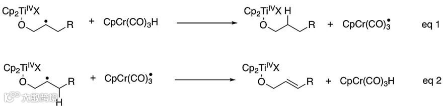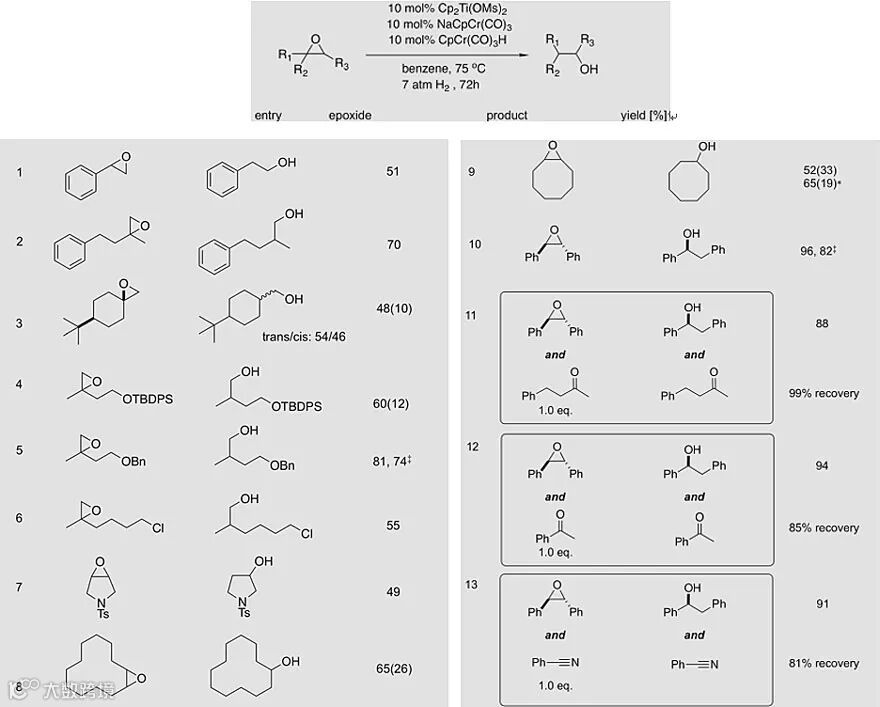 在非对称的例子中,得到的是反马氏醇,因为在环氧开环时最多取代的自由基2更稳定。主要的副产物是烯丙醇,源于CpCr(CO)3•的进一步攫氢(图5,eq 2)。加入更多的CpCr(CO)3H能够提高氢转移到烷基氧自由基2的速率(图5,eq 1),并在2被CpCr(CO)3•攫氢的竞争反应中处于有利地位,因此,烯丙醇副产物被抑制,而得到更高产率的饱和醇。