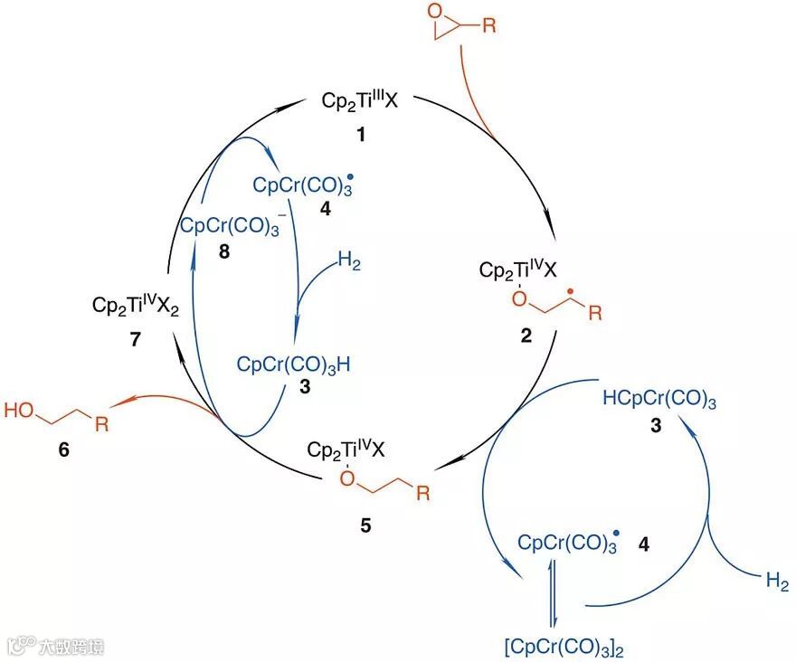 事实上,德国波恩大学Andreas Gansäuer教授曾发现三价钛化合物1可以对环氧进行单电子还原产生自由基2(自由基处于取代基多的位置),后者可以从1,4-环己二烯、Bu3SnH、硫醇、硅烷或金属氢化物上攫氢,最后金属烷氧键在质子酸作用下断裂得到反马氏规则的醇 [7],锰粉还原四价钛络合物得到三价钛1,使得反应对金属钛实现催化循环。另一方面,美国哥伦比亚大学Jack Norton教授课题组的工作发现CpCr(CO)3H(3)的键离解能只有62 kcal mol-1,可以作为氢自由基供体 [8],从而可以将氢自由基转移给化合物2而得到四价钛的烷基氧化物5。而化合物3的再生,可通过自由基CpCr(CO)3•(4)及其二聚体的氢化得到,因此可使得该反应对金属铬循环。再者,3似乎能够重生化合物1,从而促进环氧开环,实现反应对金属钛的循环。化合物3是酸性的,在乙腈中测得pKa为13.3,与Gansäuer课题组所用氢供体接近,也应该能够质解四价钛的烷基氧化物5。化合物3的共轭碱[CpCr(CO)3]−是一个很好的单电子还原剂,在乙腈中的电势为-0.67 V,和Cp2TiCl2非常接近。在初期的实验探索中,也的确从实验中观测到了质解和单电子还原过程。那么钛/铬催化联合起来,是不是就能完成从环氧化物到反马氏醇的转化呢?这个idea在2013年Gansäuer组与Norton组的一次合作中被提了出来。他们希望通过钛催化的环氧化物开环和铬催化H2作为H•、H+、e-的形式参与到环氧化物到反马氏醇的转化中去。