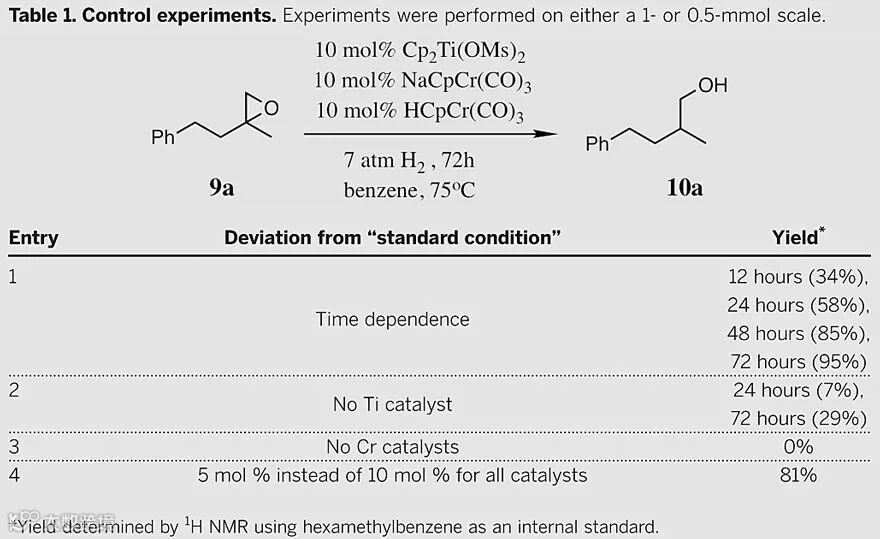 如下表所示,通过大量的条件优化,研究人员发现该转化在10 mol% Cp2Ti(OMs)2/10 mol% NaCpCr(CO)3/10 mol% HCpCr(CO)3的苯溶液体系中效率最高,并且转化率呈时间依赖性,在72 h时达到最高。图3显示,金属钛和铬对于反应的高效转化必不可少。其中金属钛自身没有活性,而铬自身有非常有限的活性(10 mol%用量,24 h只有7%的转化率,铬体系可能有一些电子转移活性)。