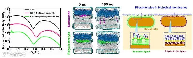 图2. X射线液体界面散射与分子动力学模拟结合,揭示表面活性剂、聚电解两类不同稳定性的配体所修饰的纳米颗粒与磷脂分子层相互作用的机制。