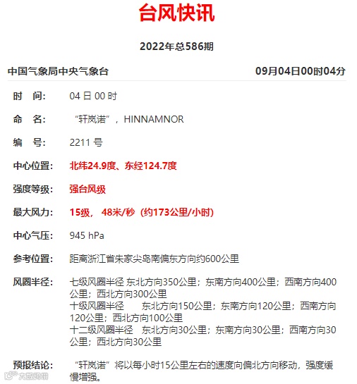 中央气象台9月3日18时继续发布台风黄色预警:预计,“轩岚诺”将以每小时15-20公里的速度向北偏西方向移动,4日夜间到5日早晨将在浙江近海海面北上,5日上午以后逐渐转向东北方向移动,趋向朝鲜半岛南部到朝鲜海峡。