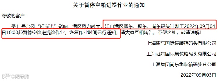洋山港区盛东、冠东、尚东码头计划于2022年09月04日10:00起暂停空箱进提箱作业,恢复作业时间另行通知,不便之处,敬请谅解!