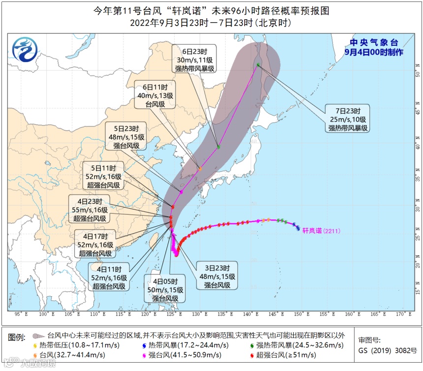 9月3日20时至4日20时,台湾以东洋面、东海中南部、杭州湾、浙江东北部沿海的风力有9-12级,阵风10-13级,“轩岚诺”中心经过的附近海面的风力有13-16级,阵风可达17级及以上。