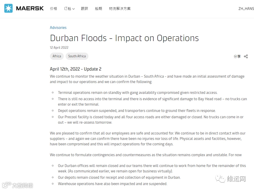 4月12日,马士基发布公告:德班受到强降雨的影响,导致许多地区发生严重洪水并造成广泛破坏。目前,所有仓库都受到洪水和强降雨的严重影响,并已关闭。所有运输商都停止了他们的车队。停止的码头运营仍然暂停,码头也无法接收卡车。
