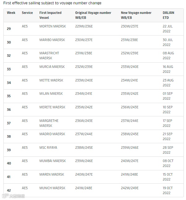 马士基表示,亚洲-北欧网络的瓶颈导致服务出现延误。在充满挑战的情况下,马士基将为客户改善货物交付,但即使是轻微的中断也会造成连锁反应并导致重大挫折。这种情况是由一些外部因素驱动的,主要是码头拥堵,虽然马士基在竭尽全力为客户解决这种情况,但AE5的累积延误导致了需要调整的始发船期。为了协调整个市场的网络部署并提高船期的可见性——马士基做了以下的船期调整。