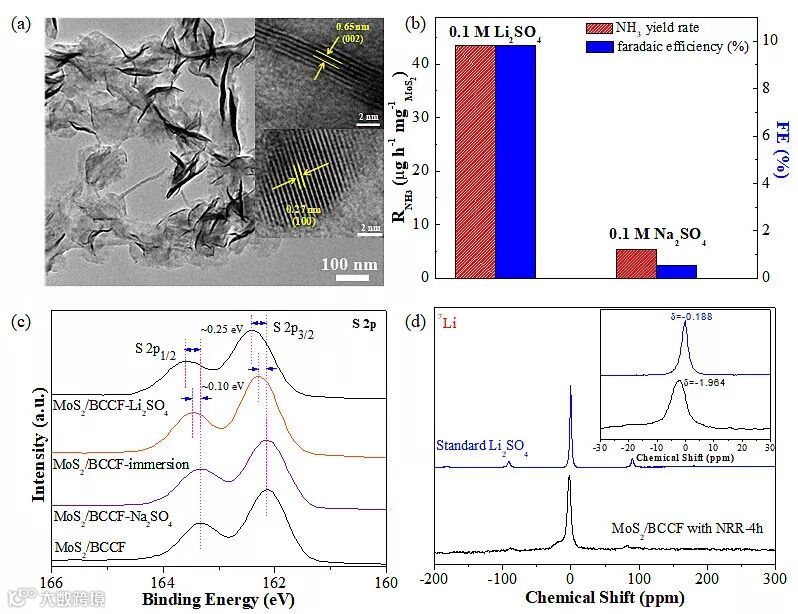 图2. (a) MoS2/BCCF的TEM表征(插图为HRTEM);(b) MoS2/BCCF在不同电解液中的产氨效率和法拉第效率;(c) MoS2/BCCF反应不同时间后的XPS高分辩S谱;(d) MoS2/BCCF反应后的固态核磁锂谱。