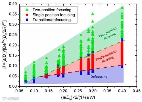 A:研究过程中最大的困难在于如何把实验测得的大量数据与理论分析联系起来。对于工作图谱的横坐标和纵坐标的选择,由于涉及的参数包括四个无量纲参数(粒子阻塞率、曲率比、迪恩数和通道高宽比),如何与颗粒的惯性聚焦状态建立直接的联系是一项非常大的挑战。我们尝试了20多种不同的横坐标和纵坐标搭配方式,剔除了大部分非常紊乱和无规律的图谱,最后找到了一种较为理想的线性结果。