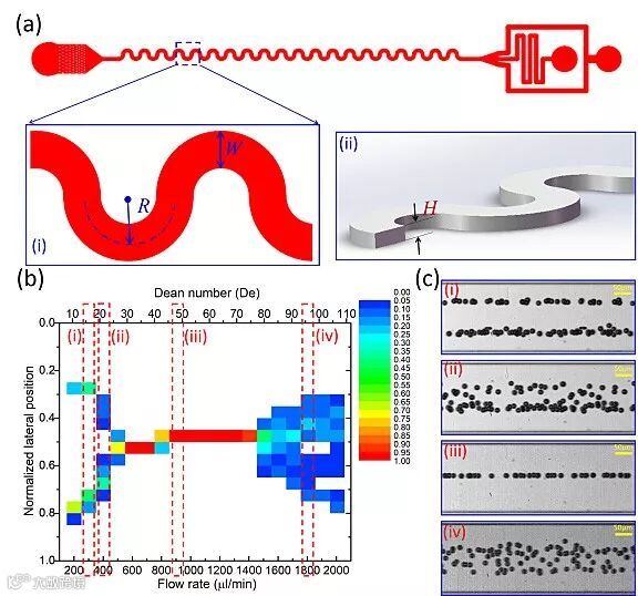 A:这项工作主要是探索研究惯性聚焦现象的基础调控机理,并没有涉及具体生物化学方面的应用。但是基于这项工作提出的设计原理,理论上我们可以根据目标生物颗粒(比如血液细胞或者疟疾病原体)的尺寸计算出正弦形流道的结构尺寸,由此可以作为实验测试的初始尺寸,然后通过不断的迭代优化来确定最优的管道尺寸。另外,基于这种结构类型的微流控技术主要功能是分离或者过滤水溶液中特定尺寸的细胞或者其他微纳米颗粒,它的优势在于无需生物标记、对细胞基本无损伤,并且可连续工作、高通量、可处理较大体积生物样本。潜在的应用领域可能包括污水处理、生化反应器、循环肿瘤细胞(CTCs)液体活检及血液处理等等。我们团队已经与一些企业和机构展开了技术应用方面的合作。同时,我们也欢迎更多的研究机构和企业联系我们,基于该技术展开进一步的技术开发与应用合作研究。