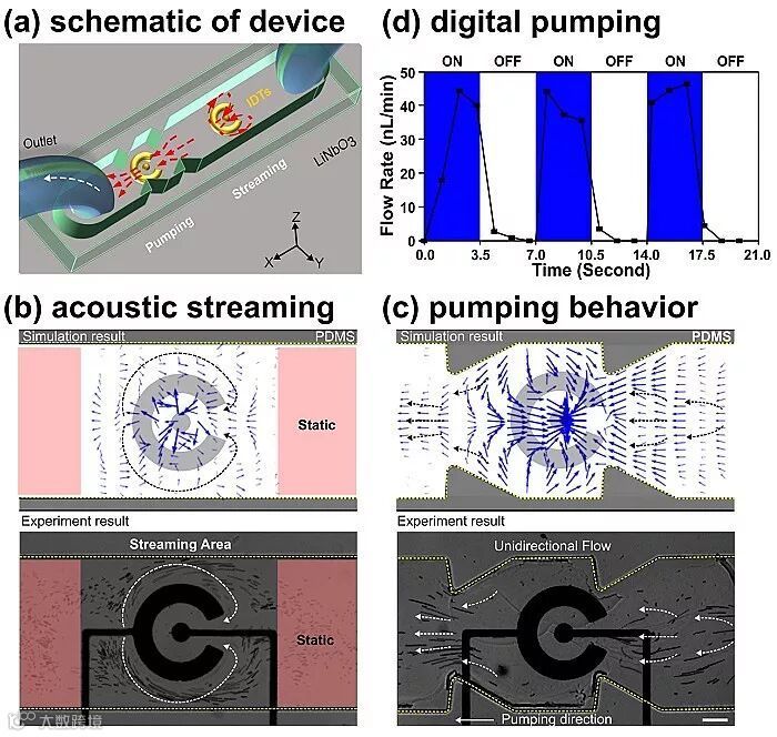 如下图1a所示,该团队把该IDT集成到微米尺度的通道,成功实现了稳定的局域声流 (acoustic streaming) 和液体泵送功能 (acoustic pumping)。在直型沟道中,IDT经过正弦交流电信号的激励,可以引发压电基底的振动从而带动液体运动,也就是声流。再通过改变沟道的形状,可以使得基底的振动带动液体形成单一方向的运动状态,也就是液体泵送。通过用Comsol有限元仿真软件把该声场成功和微通道的液体耦合(图1b),在理论上验证出了这种新型IDT可以产生稳定声流的功能;并且通过用2微米的粒子来表征流场,在实验上观察出流场的分布。在稳定流场的基础上,他们再次创新地改变通道的微结构,实现了单一方向的液体驱动功能(图1c),能够达到40 nL/min的泵送流速。再通过输入脉冲信号,在短时间内可以实现对驱动纳升液体的调节(图1d)。总而言之,该团队首次设计出一种新型的声表面波器件,实现了稳定声流的产生和可调的纳升级的驱动。