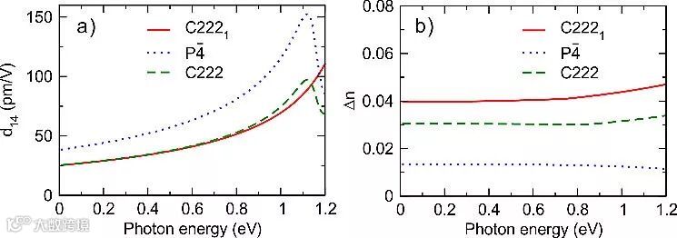 图4. 本工作获得的硒化镓的3种结构模型的理论NLO系数张量和双折射率