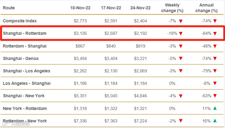 上周四德鲁里WCI货柜运价指数,单周下跌7%,年减74%,指数来到2404点;其中欧洲线下跌18%,年减84%,跌幅最重,每大箱运价来到2192美元,创下2020年10月22日以来的两年新低。