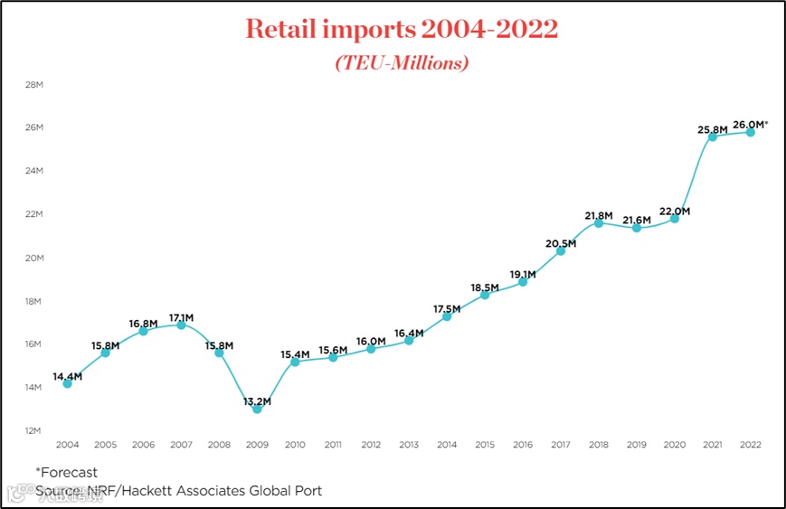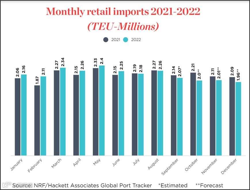 根据美国零售联合会(NRF)和咨询公司Hackett Associates日前发布的月度《全球港口追踪》(GPT)报告,尽管零售额继续增长,但到2022年底,美国主要集装箱港口的进口量预计将降至近两年来最低水平。