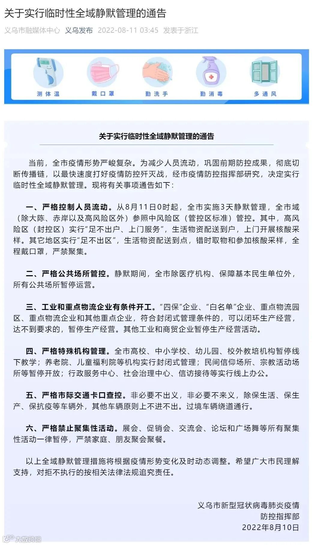 导读:点击蓝字,关注我们8月11日凌晨03:45,“义乌发布”公众号发布《关于实行临时性全域静默管理的通告》称,当