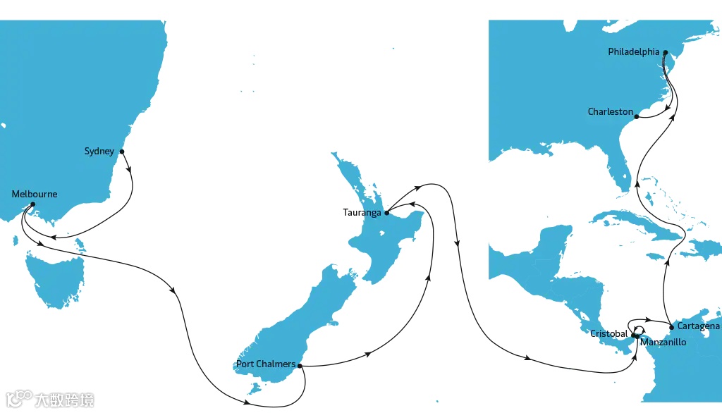 于OC1航线(澳新-中南美航线),涉及HAMBURG SÜD、HAPAG-LLOYD、MAERSK、MCC、MSC、SEAGO、SEALAND等多家船公司共舱。