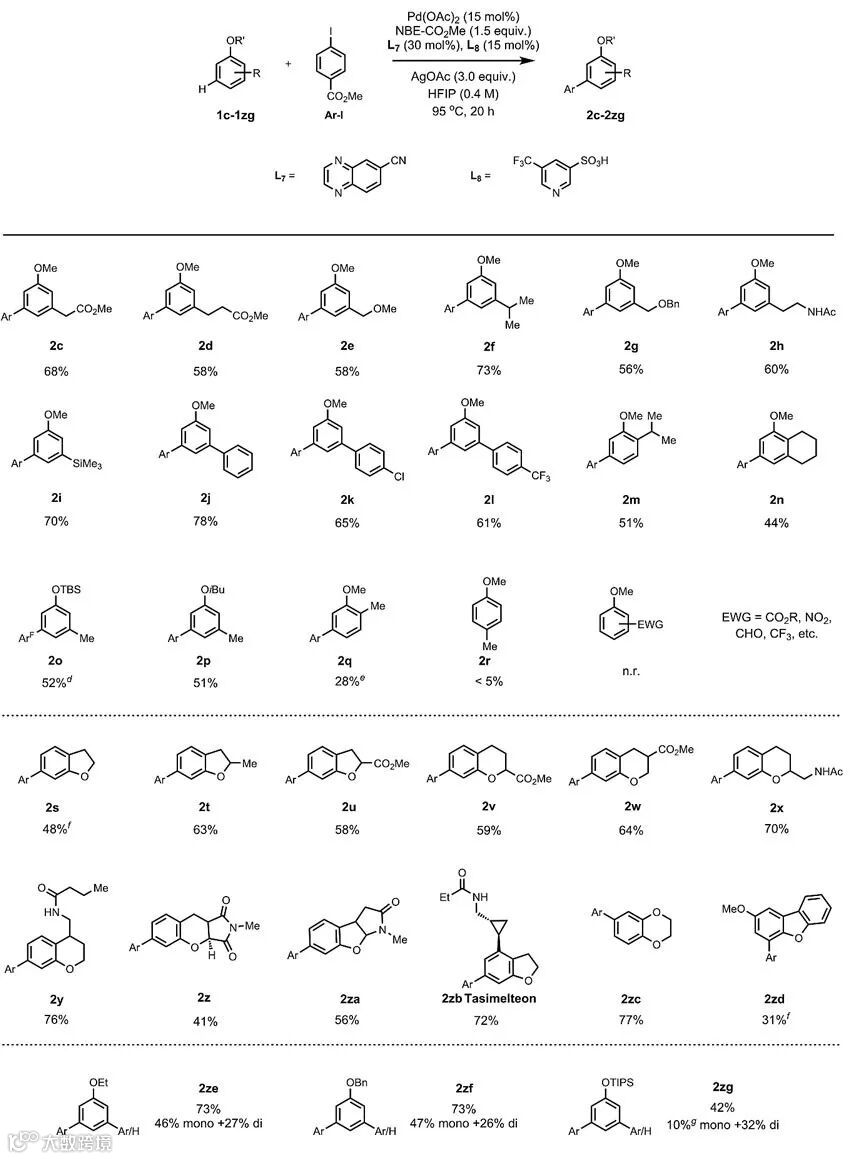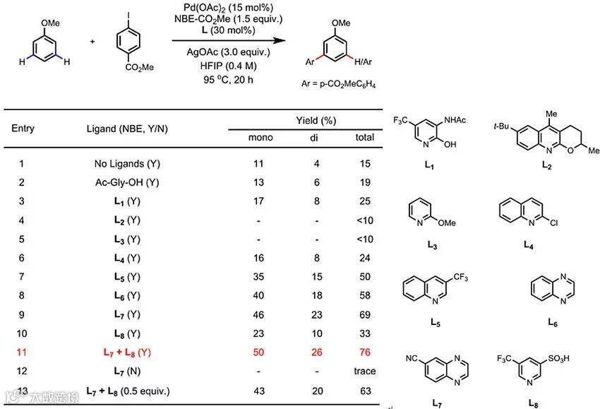研究人员首先用苯甲醚作为底物进行反应条件优化,惊喜地发现在2.0当量芳基碘代物/15 mol%醋酸钯/1.5当量NBE-CO2Me/3.0当量AgOA和六氟异丙醇 (HFIP) 作为溶剂的体系中能以15%的收率得到苯甲醚间位单/双芳基化的C-H键活化产物(entry 1),这也验证了作者的构想。结合作者之前研究发现,缺电子的2-吡啶酮可以加速无导向基团的C-H键活化(Nature, 2017, 551, 489,点击阅读详细),但对于这个转化也仅仅将收率提高到25%(entry 3),而富电子的吡啶类配体却完全终止反应(entries 4、5)。意外的是,研究人员发现缺电子的配体对该转化是有利的(L5-7)。控制实验表明,L7配体自身在无NBE-CO2Me下没有活性,显示出NBE-CO2Me在间位选择性芳基化反应中的重要作用。另外,作者也考虑到,对于这样一个涉及多步的复杂催化体系,优化的配体对于每一步可能作用不同,因此作者也考察了双配体体系,发现尤其是配体L7和L8联合使用时能得到最优的收率(entry 11)。