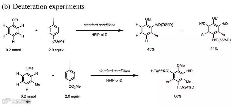 前文已经提到,研究人员起初设想的是苯基醚的邻位钯化后被降冰片烯捕获,接着发生Catellani C–H键芳基化得到间位官能团化的产物。为了验证这个假设,研究人员利用动力学同位素实验发现:间位单芳基化的产物中约70%氘代发生在C2位,这说明单芳基化产物源自邻位C-H钯化,并且催化循环终止于C2位质子化(也就是引入氘的步骤)。有趣的是,对于间位双芳基化产物,分别有27%和55%的氘代发生在C2和C4位。对位氘代源自底物最初的对位C-H钯化和随后的连续双芳基化反应(Catellani反应);而单芳基化产物还可以进行进一步的邻位C-H钯化,也可继续生成双芳基化产物,这可能是邻位氘代的原因,这一假设也被1b单芳基化的氘代实验所验证(下图b)。