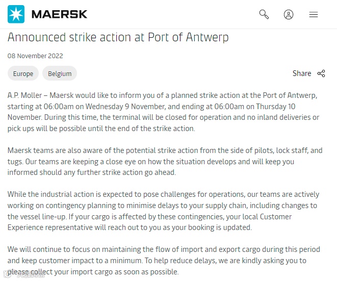 丹麦航运公司马士基在最近的客户咨询中表示,在宣布的为期一天的罢工期间,码头将关闭运营,在罢工行动结束之前,将无法进行内陆交付或提货。