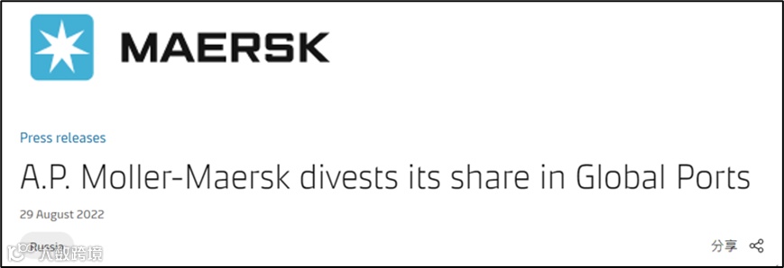 8月29日,马士基官网发布公告称,马士基的码头业务APM Terminals(APMT)已达成协议,将其在俄罗斯集装箱码头运营商Global Ports Investments PLC (GPI)的30.75%股权出售给长期合作伙伴Delo Group。