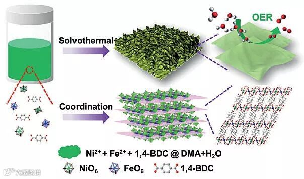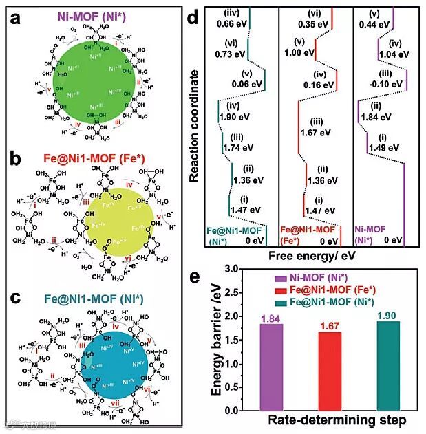 此外,他们利用光谱表征和理论计算的结果也证明了材料中Fe作为真正的活性位点,在电催化性能的提高上起到了关键的作用,同时,根据各个金属位点上不同反应过程的吉布斯自由能的变化,提出了不同金属位点上可能的水氧化反应机理。这项工作不仅为二维MOF纳米片的合成提供了简单有效的新策略,还为高效电催化剂的设计提供了新思路。