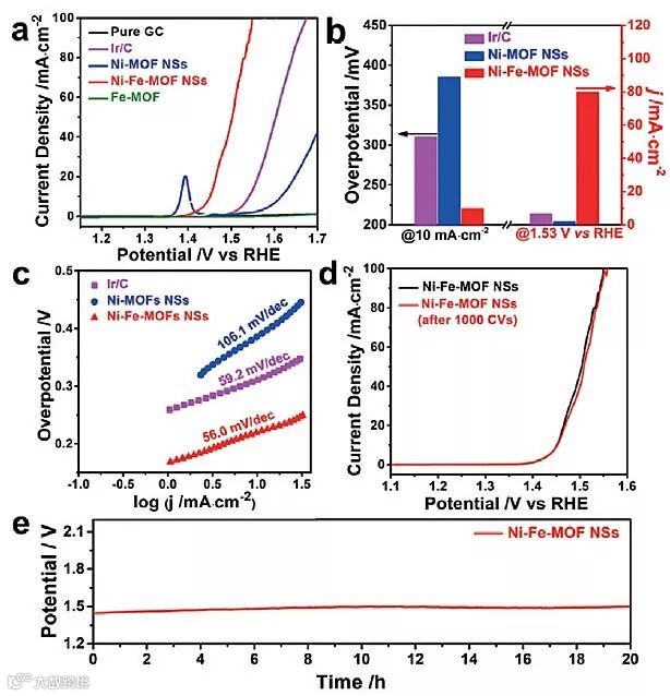 根据形貌表征的结果,合成得到的双金属MOF(Ni-Fe-MOF)材料呈现出超薄的纳米片形貌。他们通过对MOF纳米片的物相、组分和热分析等一系列细致的表征,结合已报到的Ni-MOF([Ni3(OH)2(1,4-BDC)2(H2O)4]•2H2O, CCDC No. 638866) 的晶体结构,推导出了合成的双金属MOF纳米片的组成和结构([Ni2Fe(OH)2(1,4-BDC)2(H2O)4(SO4)0.5]•4H2O)。电催化结果显示,在碱性电解质中,该超薄的MOF纳米片在10 mA•cm-2电流密度下的过电势仅为221 mV,塔菲尔斜率为56.0 mV•dec-1(iR-correction后),优于目前报道的大多数非贵金属水氧化催化剂,该材料在稳定性上也表现出优异的性能。