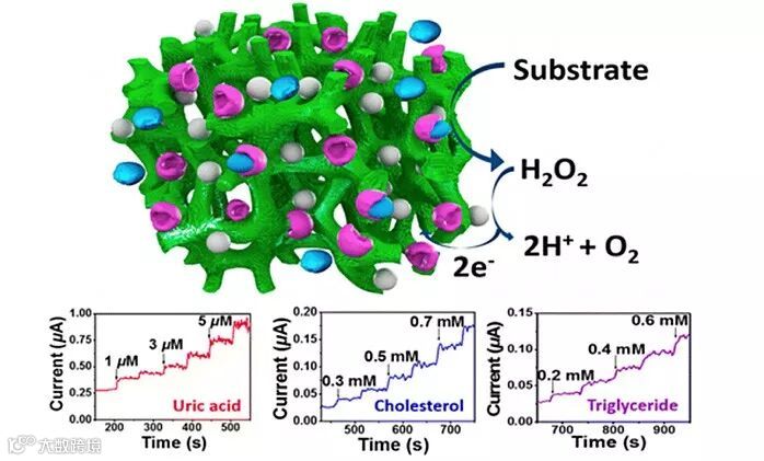 本文首次利用多级纳米结构导电聚合物水凝胶设计了一个灵敏的生物传感器平台,可用于检测各种人体代谢物,如尿酸、胆固醇和甘油三酯。