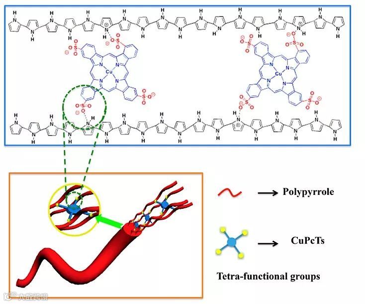 本文首次利用超分子方法并用盘状液晶分子(3,4',4'',4'''-四磺酸四钠盐,CuPcTs)作为掺杂剂可控原位合成了一维纳米结构导电聚吡咯(PPy)水凝胶。与普通PPy相比,该水凝胶具有增强的链间电荷传输,增强了导电性和赝电容。
