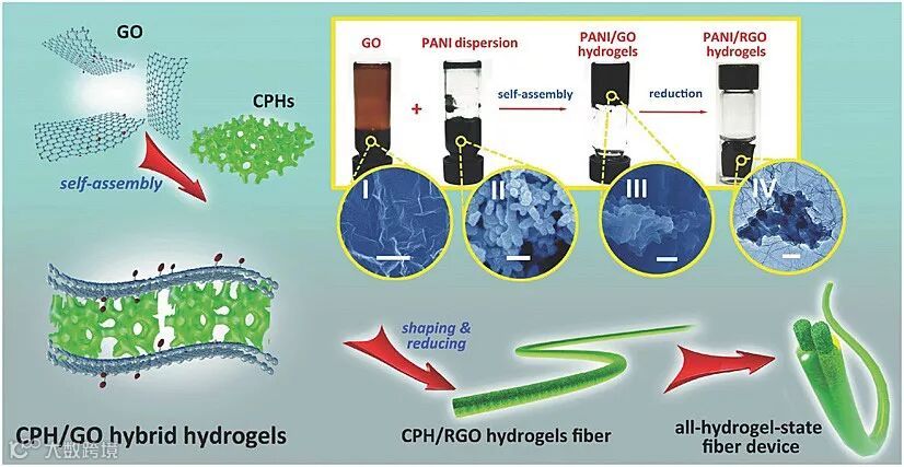 为同时改善柔性超级电容的机械性能和电容量,该课题组利用纳米导电聚合物凝胶增强石墨烯纤维的力学强度,首次实现凝胶态聚苯胺/石墨烯复合材料的柔性,可塑性及优异的电化学性质。