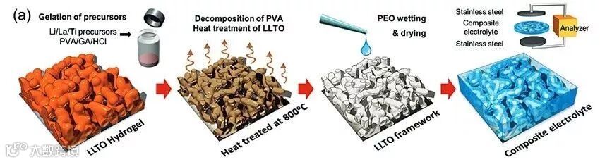 相比于常用的液态电解质,固态电解质可极大改善锂离子电池的安全性和稳定性。本文首次利用水凝胶的框架结构制备含有Li0.35La0.55TiO3的三维固态电解质, 并成功将其室温锂离子电导率提高到10−4 S cm−1 。