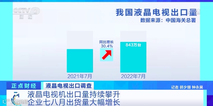 中国海关总署最新数据显示,我国液晶电视出口持续增长。7月出口843万台,同比增长30.4%。1-7月累计出口5158万台,同比增长16.4%。业内人士认为,近年来中国制造的电视机产品,在质量和技术上均达到了国际领先水平,受到海外消费者的认可。