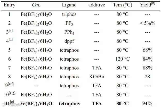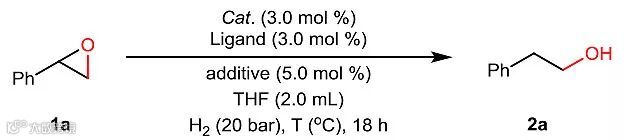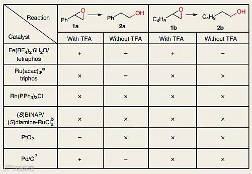 作者以苯乙烯环氧化物(1a)的作为底物,先对Fe(BF4)2•6H2O/膦化合物体系中的配体进行了考察,当使用这些常用的配体时,比如PPh3、dppf和triphos,反应不进行;但使用四齿膦配体tetraphos(即tris(2-(diphenylphosphanyl)phenyl)phosphane)时,以68%的产率获得所期望的产物2-苯乙醇(2a)。令人惊讶的是,使用tetraphos的衍生物(tris(2-(diphenylphosphanyl)ethyl)phosphane)作为配体时,转化率极低(<5%)。随后,作者发现加入三氟乙酸(TFA),可显著的提高2a的收率(94%)。作者也比较了一些其它催化体系,值得注意的是,Pd/C催化对芳基环氧化物加氢表现出活性,但对烷基环氧化合物却没有效果,这也突出了Fe(BF4)2•6H2O/四齿膦体系的普适性。