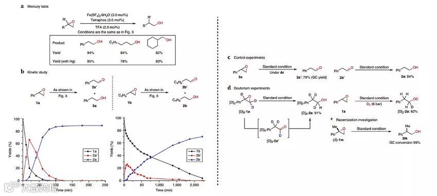 最后,作者对反应的机理进行了研究。动力学研究表明,在1a和1b的反应过程中,主要中间体分别是醛2a'和2b',其中苯乙烯环氧化物的反应中,2a'加氢生成2a是决速步;而另外己烯环氧化物的反应中,1b发生Meinwald重排生成2b'是决速步。进一步的控制对照实验和氘代实验均表明反应经过醛中间体的过程。