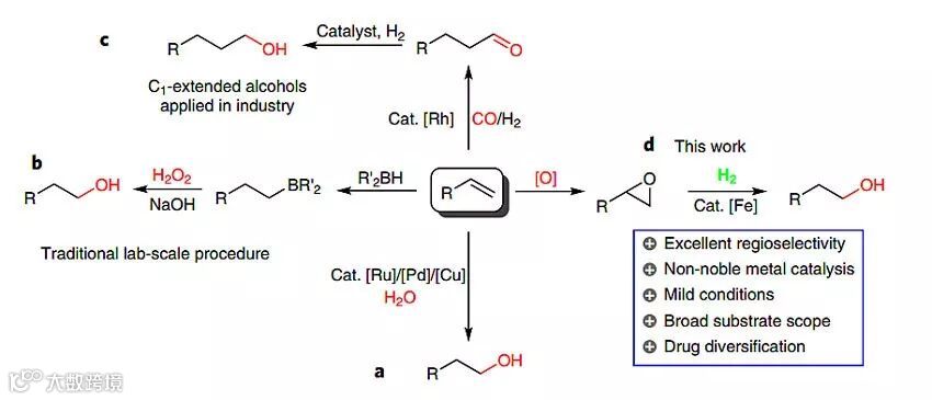 伯醇广泛地应用在医药、农药、香料等和化学工业相关的领域中,因此开发出高效的伯醇合成方法具有非常重要的价值。在过去的几十年中,有许多使用烯烃作为起始原料来合成伯醇的例子被报道(图1)。实验室中最常用的合成方法是以烯烃为起始原料,利用连续的氢硼化/氧化反应来得到伯醇(图1b),虽然该策略被普遍使用,但它需要化学计量的硼烷试剂。因此,开发可规模化生产伯醇的方法仍具有挑战。
