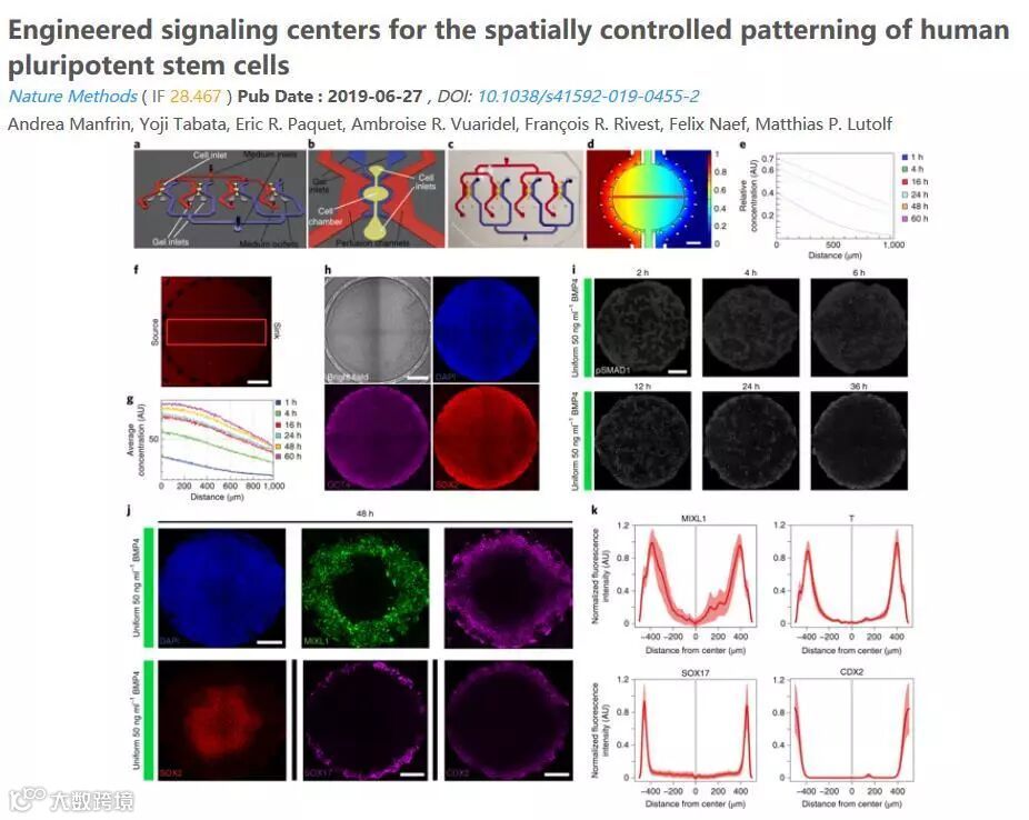 Nature Methods发表了一篇微流体在干细胞研究方面的相关论文,题为“调控的信号中心用于人类多能干细胞的空间上的可控图案化”。在论文中,作者借用了Comsol的扩散传质模型,进行了浓度梯度动力学的计算,并对装置内可溶性分子的扩散过程进行了模拟。