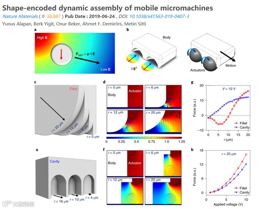 Nature Materials 发表了一篇 题为“可移动微型机器的形状编码动力学组装”的论文。论文中,作者借助Comsol的电学模块,对不同三维形状介质体周围电场强度的进行了计算,用于计算微型机器表面的受力分布。