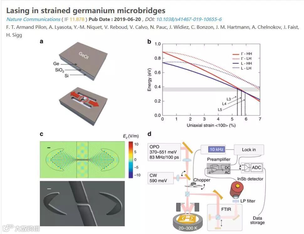 Nature Communications 发表了一篇“应力下锗微米桥发射激光”的论文。论文中,作者借用Comsol的电磁和光学模块,计算了TE空腔谐振模的近场图案,用于研究微米桥中的激光发射。