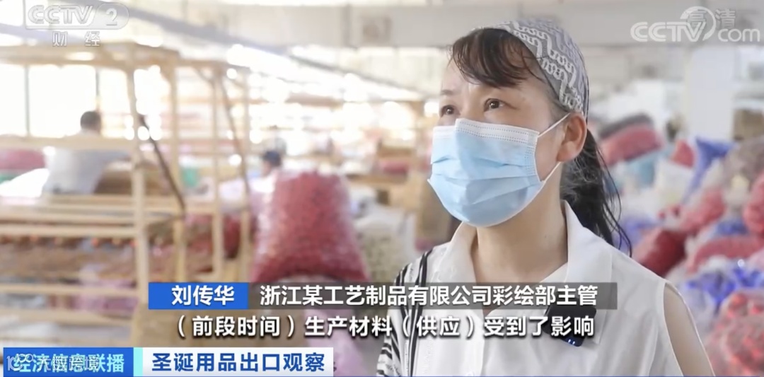 在一家圣诞用品生产工厂的仓库里,52个集装箱的货物将要被发往法国、德国、意大利、澳大利亚、新加坡等地。工厂负责人介绍,这段时间为了生产和出货两手抓,工厂加派了50多人两班倒,24小时不间断出货。