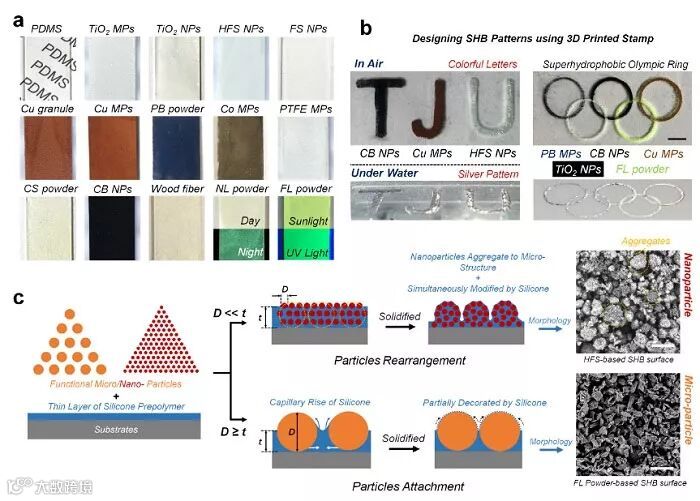 为进一步提升超疏水界面的功能,天津大学化工学院曹墨源团队联合中国科学院理化技术研究所吴雨辰团队,以商品化硅橡胶(聚二甲基硅氧烷,PDMS)为媒介(“胶水”),成功建立了对几乎任何微/纳米尺度粒子(“粉末”)都适用的超疏水界面构建方法——“胶水+粉末”法。作者选取了17类常见的功能微/纳米粒子作为研究对象,包括金属颗粒、金属氧化物、非金属氧化物、高分子材料等,证明了此超疏水化方法的普适性和高效性,进一步借助所选用纳米粒子的特殊性质,实现了多功能超疏水界面的设计及构建(图1)。相关成果近期发表在Cell Press旗下材料学旗舰期刊Matter 上。