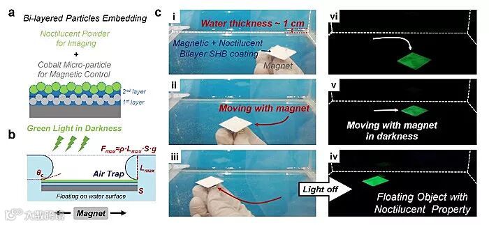 除了上述基于单一种类粒子的超疏水界面设计,此方法也适用于层层堆积式的多功能超疏水界面构建。研究者通过在刚性薄片上先制备一层具有磁响应性的钴粒子超疏水界面,再重复此方法,在其上层制备一层夜光粒子超疏水界面,实现了具有磁控能力的夜光漂浮体。源于超疏水材料的拒水能力,所制备的双层涂层可以使刚性薄片在水面稳定漂浮,并在黑暗环境中显示出明亮的绿色荧光(图6)。