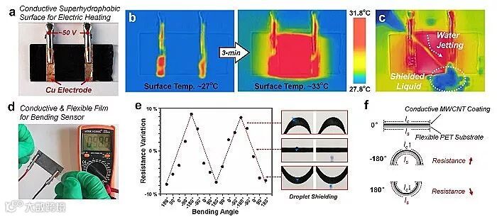 基于此方法优异的普适性和可靠的疏水性,研究人员通过使用不同功能的微/纳米颗粒粉末,实现了多功能性的超疏水界面制备。例如选择具有导电性的多壁碳纳米管颗粒,实现了超疏水电热界面以及超疏水力学传感器的构建。如图3a-3c所示,通过外加50V直流电压,超疏水涂层可以在短时间内加热,并且保持优异的疏水性质。通过将此涂层处理在柔性PET基底上,可以通过对电阻的考察,对界面材料的内外弯曲程度进行监控,为将超疏水材料应用于柔性器件提供了可行方案(图3d-3f)。