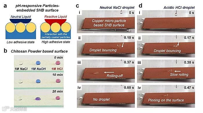 通过引入具有pH响应性的颗粒,可以实现超疏水界面对于不同性质液滴的响应性操控。利用具有两性的壳聚糖粒子和铜微米粒子制备的超疏水界面,可以快速响应酸碱性液滴(图5)。因其硅橡胶对微米级粒子的包覆并不完全,当液体与嵌入粒子长时间接触时,在化学能释放的推动下,液体与界面产生浸润,从而改变了超疏水界面的性质。以此为基础,可以设计出快速鉴定酸碱性液滴的超疏水界面,如图5c所示,中性液滴可以快速从铜微米粒子界面上滚落,而酸性液体在几经碰撞后将滞留在此超疏水界面之上。