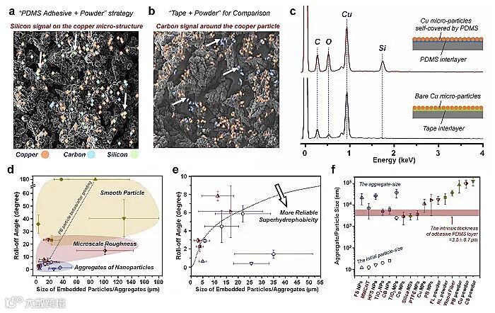 文中报道的实验方法简便、快捷,在制备中最大程度地限制了有机溶剂的使用。同时,在涂层固化的过程中,表面吸附的颗粒进行自组装,形成超疏水界面所需的微/纳米粗糙结构。而底层的硅橡胶也将在毛细力的牵引下主动包覆上层的微/纳米粒子,完成原位的颗粒疏水化处理。因此,此方法在微/纳米粒子选取的时候,无需考虑粒子的本征亲疏水性质,仅考虑粒子的原始尺寸,较大程度地扩宽了超疏水界面制备材料的选择范围。表面元素分析证实,固化后铜微米颗粒的上表面出现硅元素信号,说明了硅橡胶的向上迁移(图2a-2c)。通过统计分析,“尺寸越小、表面越糙”的纳米粒子可以实现更佳的超疏水性质。通过简单的研磨处理,就可以将原本疏水性不理想的普鲁士蓝粉末界面“进化”为具有小于10°滚动角的普鲁士蓝微米粒子界面(图2d)。而在疏水性方面,具有聚集结构的纳米级粒子界面(图2f)普遍性地优于微米粒子界面(图2e)。