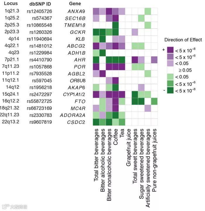 不同饮料和基因间的关联。图片来源:Human Molecular Genetics
