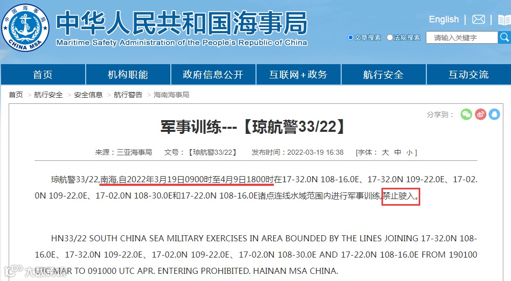 据海南海事局 :南海,自2022年3月19日0900时至4月9日1800时在17-32.0N 108-16.0E、17-32.0N 109-22.0E、17-02.0N 109-22.0E、17-02.0N 108-30.0E和17-22.0N 108-16.0E诸点连线水域范围内进行军事训练,禁止驶入。