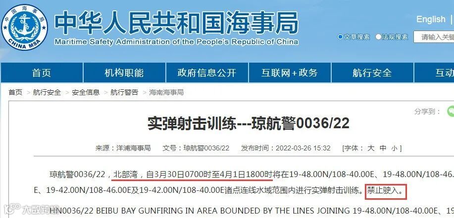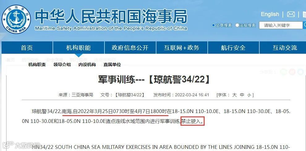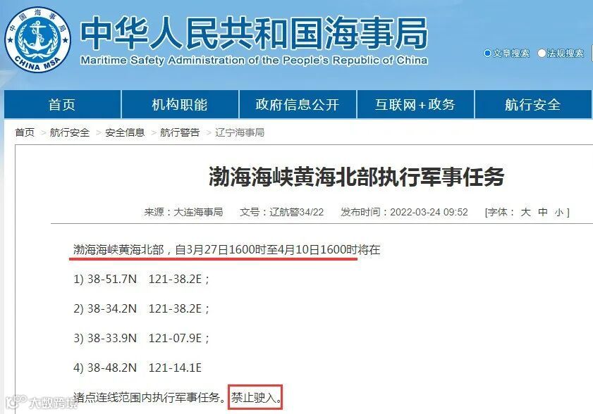 近期,多海域因军事任务频繁持续禁航,请及时了解相关信息。