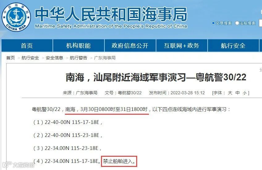 二、粤航警30/22,南海 汕尾附近海域军事演习