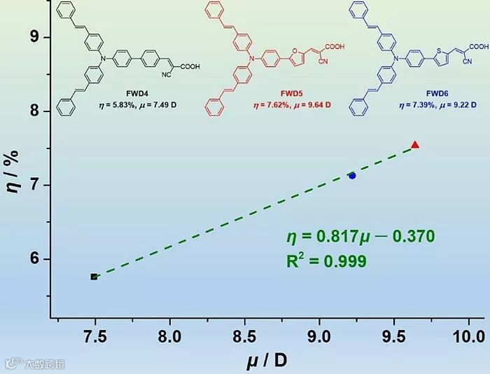 A:在我们刚刚发现染料分子的偶极矩(μ)与DSSCs器件的光电转换效率(η)之间的着近乎完美的线性关系的时候,我们对此也是深表怀疑的,认为这可能仅仅是一个巧合,毕竟能够影响DSSCs器件的光电转换效率的因素众多。对此,我们一方面通过改变器件组装条件,来验证这个线性关系的适用范围,避免结果的偶然性。另一方面,对过查阅大量文献资料,我们发现,其实这个线性关系在以前其他报道中是存在的,只不过大家只是指出了偶极矩和光电转换效率之间的正相关性,未能发现他们之间的线性关系。我们通过对这个细节的关注,使得二者之间的关系从“定性”提升到了“半定量”。所谓“半定量”,意思是我们还不能仅凭一个分子的偶极矩就能计算出光电转换效率,而是需要通过几个结构相近的染料分子的实验结果构建出线性方程之后,才能进一步地进行定量预测。是否以后能够进一步的实现真正的“定量”,则充满了未知与挑战。