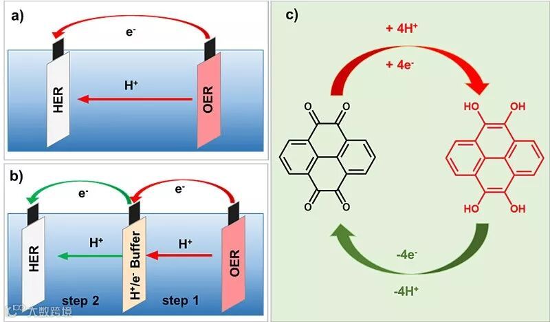 复旦大学王永刚教授研究团队针对上述问题,采用基于可逆烯醇化反应的芘-4,5,9,10-四酮(PTO)作为氧化还原电对,实现了酸性无膜分步电解制氢体系的研究。该分步电解体系包括两个步骤,即制氧步骤和制氢步骤,其制氧步骤(即步骤1)包括阳极的析氧反应(2H2O – 4e-→ O2 + 4H+)和阴极PTO电极的还原反应(PTO + 4e- + 4H+ → PTO-4H)。随后的制氢步骤(即步骤2)包括阳极PTO-4H的氧化反应(PTO-4H – 4e-→ PTO + 4H+)和阴极的析氢反应(4H+ + 4e- → 2H2)。步骤1和步骤2可以交替进行,实现了无膜条件下氢气和氧气的分步制备。他们还通过视频证明了这种分步电解体系的制氢和制氧步骤可以在不同的时间和地点进行,例如白天阳光充足的时候可以在室外依赖太阳能来电解制氧,晚上在储氢基站电解制氢实现氢气的存储。