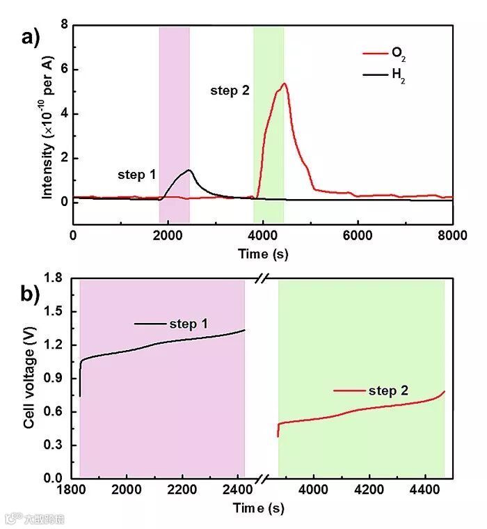 基于PTO的分步电解制氢体系有以下几个优点:一、可以得到高纯的氢气和氧气。为了证明这一点,他们利用原位差分电化学质谱对电解过程中生成的气体进行了检测,结果显示在制氧的过程中没有氢气生成,同样的在制氢的过程中没有氧气生成。二、相比膜基电解水体系来说,该体系的能耗更低了。三、氢、氧的分时制备有利于可再生能源的灵活利用,如在夜晚可以采用风能来驱动制氧,在白天可以利用太阳能来电解制氢。四、氢气和氧气的分时/分地制备有利于氢气的转移和集中存储。