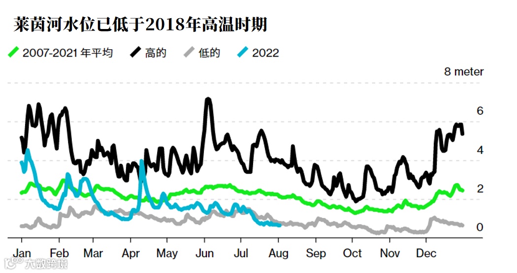 作为欧洲经济“生命线”,流经瑞士、德国、法国和荷兰(欧洲最大港口鹿特丹)等国的莱茵河是欧洲的一条重要航运通道,每年有数千万吨货物通过莱茵河在各国之间运输。德国约有2亿吨的货物依靠莱茵河运输,其水位下降将导致大量货品运输面临风险,加剧欧洲能源危机,进一步推高通胀。