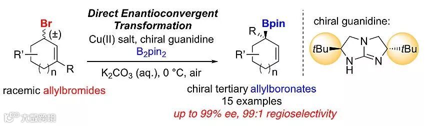 硼是一种神奇的类金属元素。由于其特殊的价电子轨道排布,硼及其化合物能在不同的条件下表现出Lewis酸性和Lewis碱性,从而分别进行亲电反应、亲核反应以及发生转金属化作用。近年来,介于其在有机化学反应中的多功能衍生化应用以及在有机转化中硼相连的手性中心可以保持的特性,通过不对称硼化反应制备手性有机硼化合物逐渐成为有机合成方法学的一大热点。近日,新加坡南洋理工大学的陈俊丰(Tan Choon-Hong)教授团队使用新型铜-胍配合物将外消旋的烯丙基溴化物通过手性汇聚(Enantioconvergent)的方式成功转化为高光学活性的烯丙基硼酸酯。利用此种方法得到的烯丙基硼酸酯具有硼取代的手性季碳中心,可以进一步通过衍生反应制备手性烯丙基叔胺和具有多个手性中心的高烯丙基化合物。